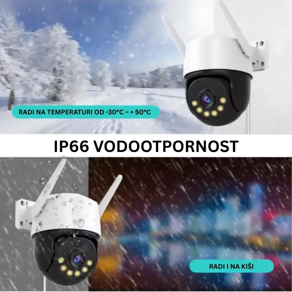 Bez obzira na vremenske uslove, spoljašnja WiFi kamera sa IP66 vodootpornim kućištem radi pouzdano 24/7. Dizajnirana za sve vremenske izazove – od letnjih pljuskova do zimskih mrazeva.